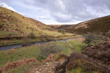 At the front of the stell, cross the footbridge over Chalk Water and take the path that climbs diagonally up the bank to the left if facing downstream. Ascend the steep path onto Kittuck Meads and follow it back, aiming for the Larkbarrow ruins now on your left. Avoid shortcuts to steer clear of boggy ground.
