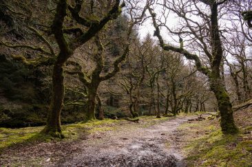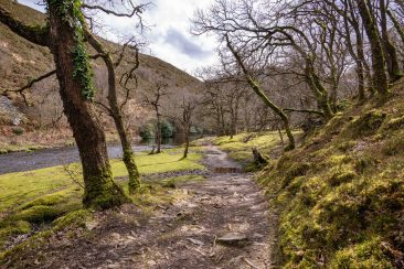 Keep to the undulating path along the edge of Maddercombe, cross the remains of a field boundary, and arrive at the stell.