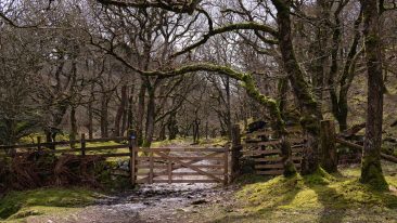 By the gate you’ll see a tree enclosure marking the remains of Larkbarrow Farm, a former dairy farm you’ll return through later. At the pedestrian gate, turn right onto the track and continue to a further wooden gate.